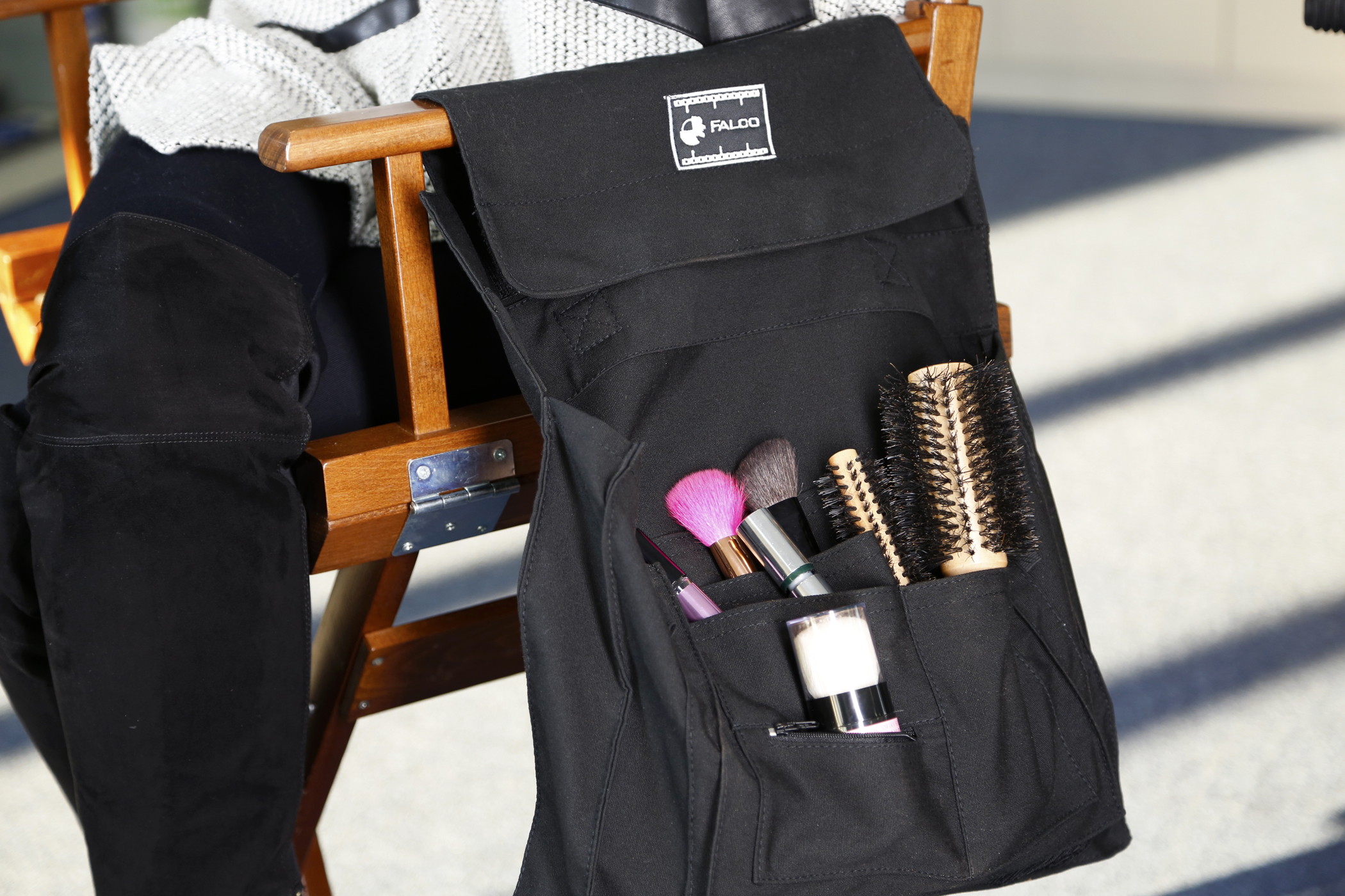 Esta bolsa auxiliar es el accesorio ideal para maquilladoras, peluqueras, estilistas, o directores, que trabajan en sets a diario. Se coloca fácilmente colgada en el lateral de la silla, proporcionando múltiples compartimentos para mantener ordenadas y accesibles brochas, sprays, peines, paletas, pinceles, claquetas, dossiers, guiones y demás utensilios de trabajo.
