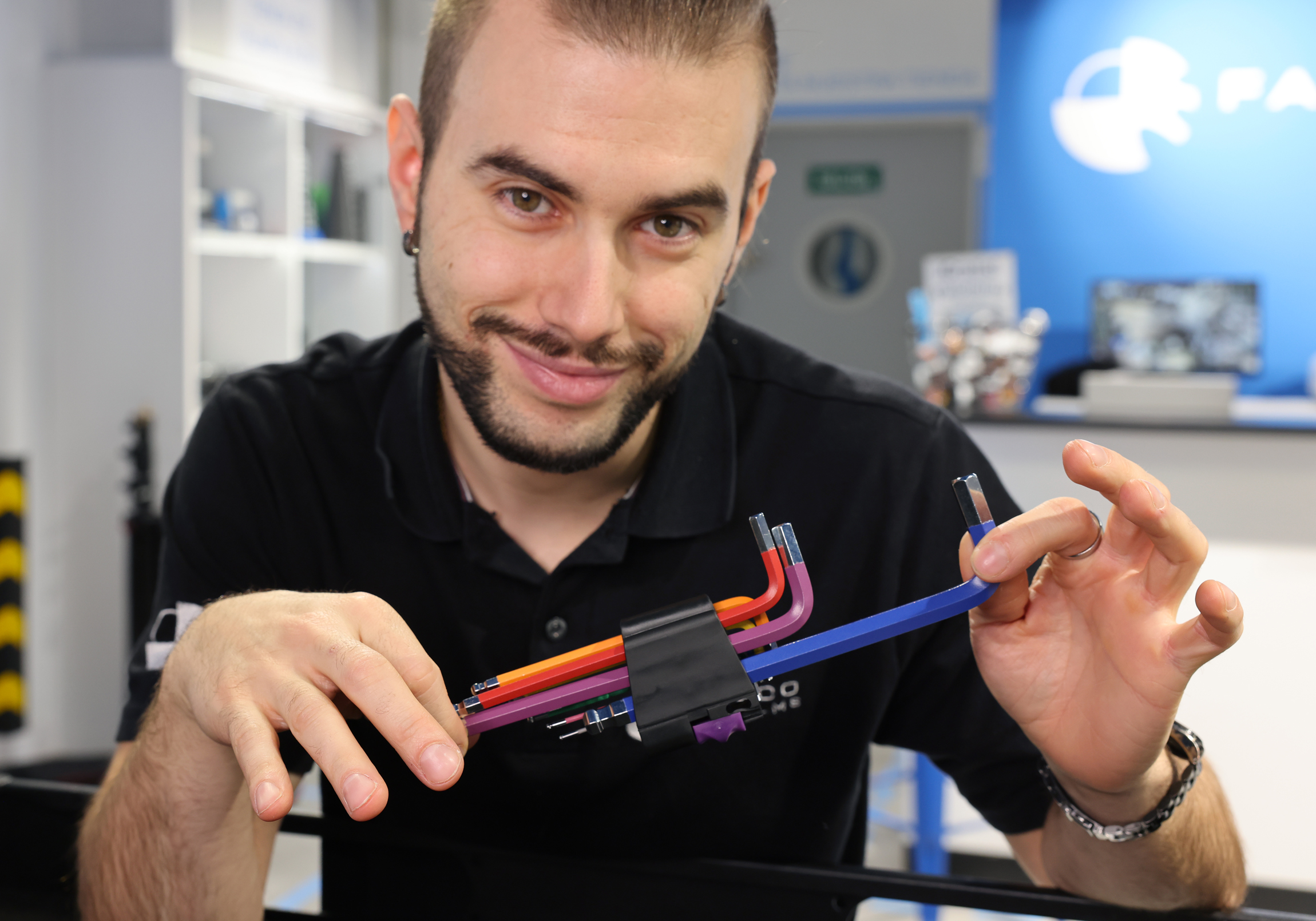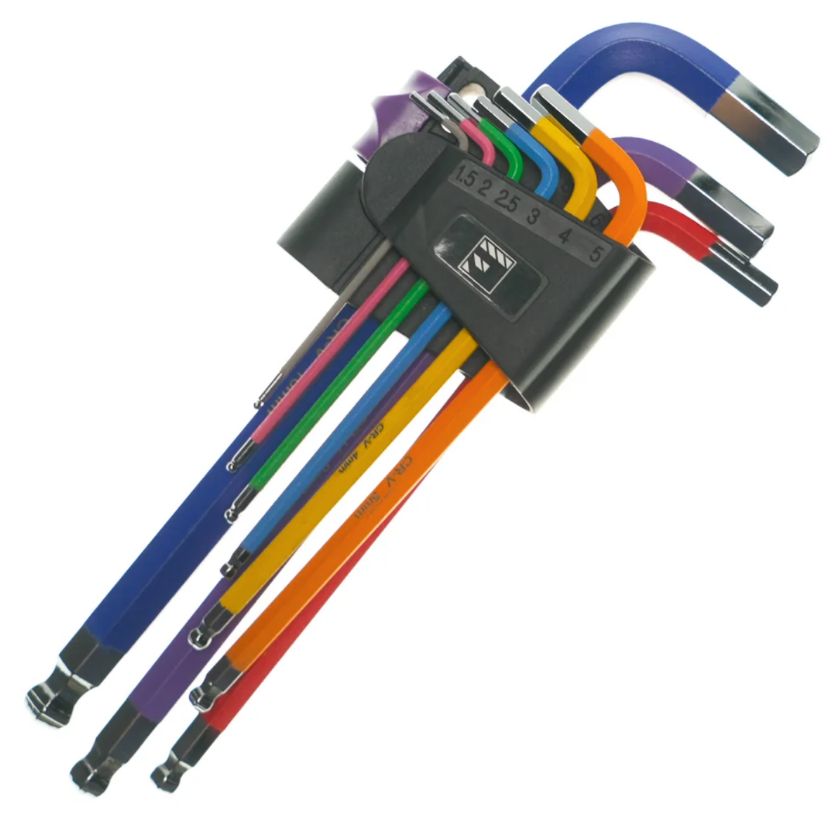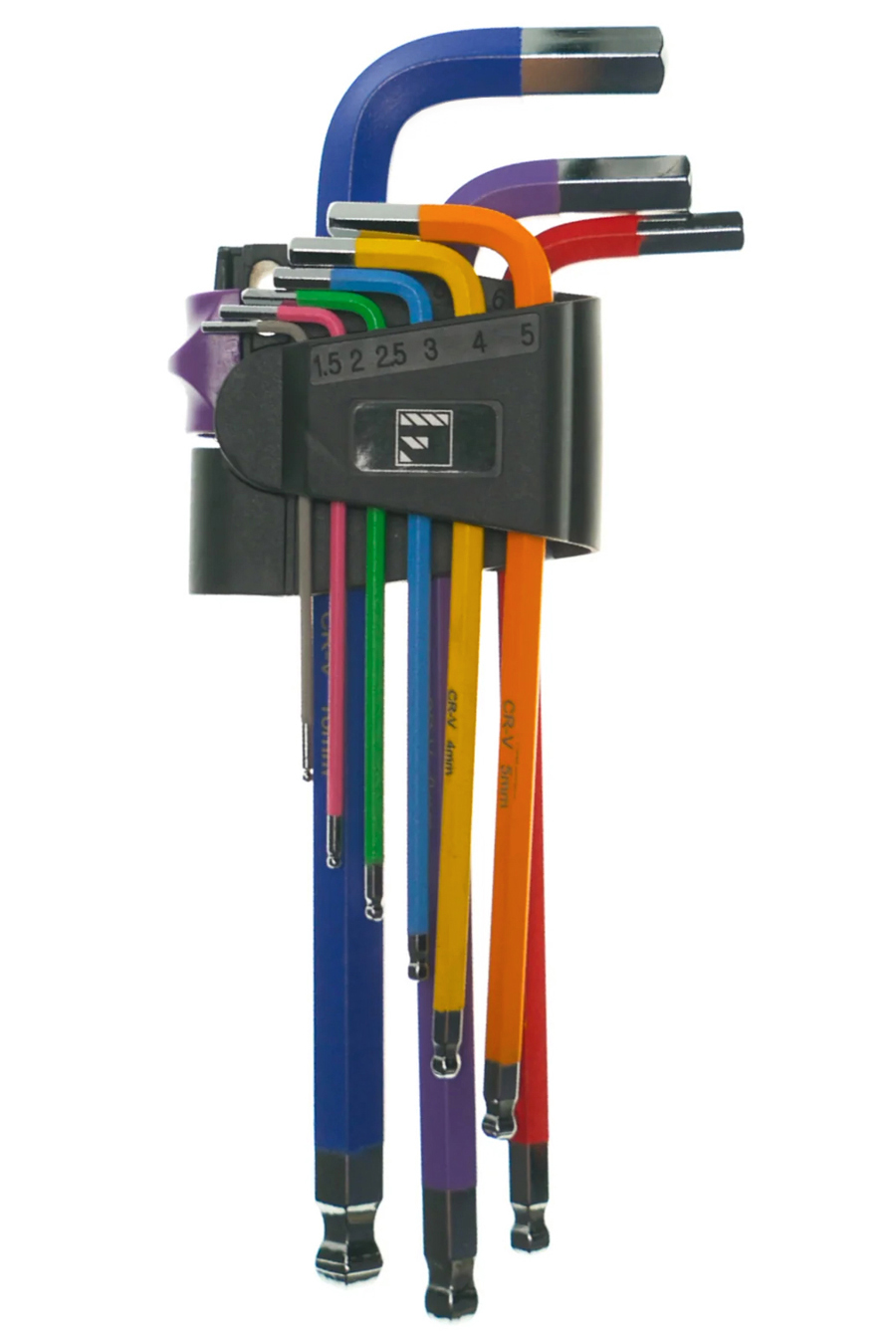 Juego completo de llaves hexagonales métricas de alta resistencia con revestimineto antideslizante y soporte organizador. Codificación por colores. Herramienta imprescindible para técnicos de rodaje, grip y montaje.