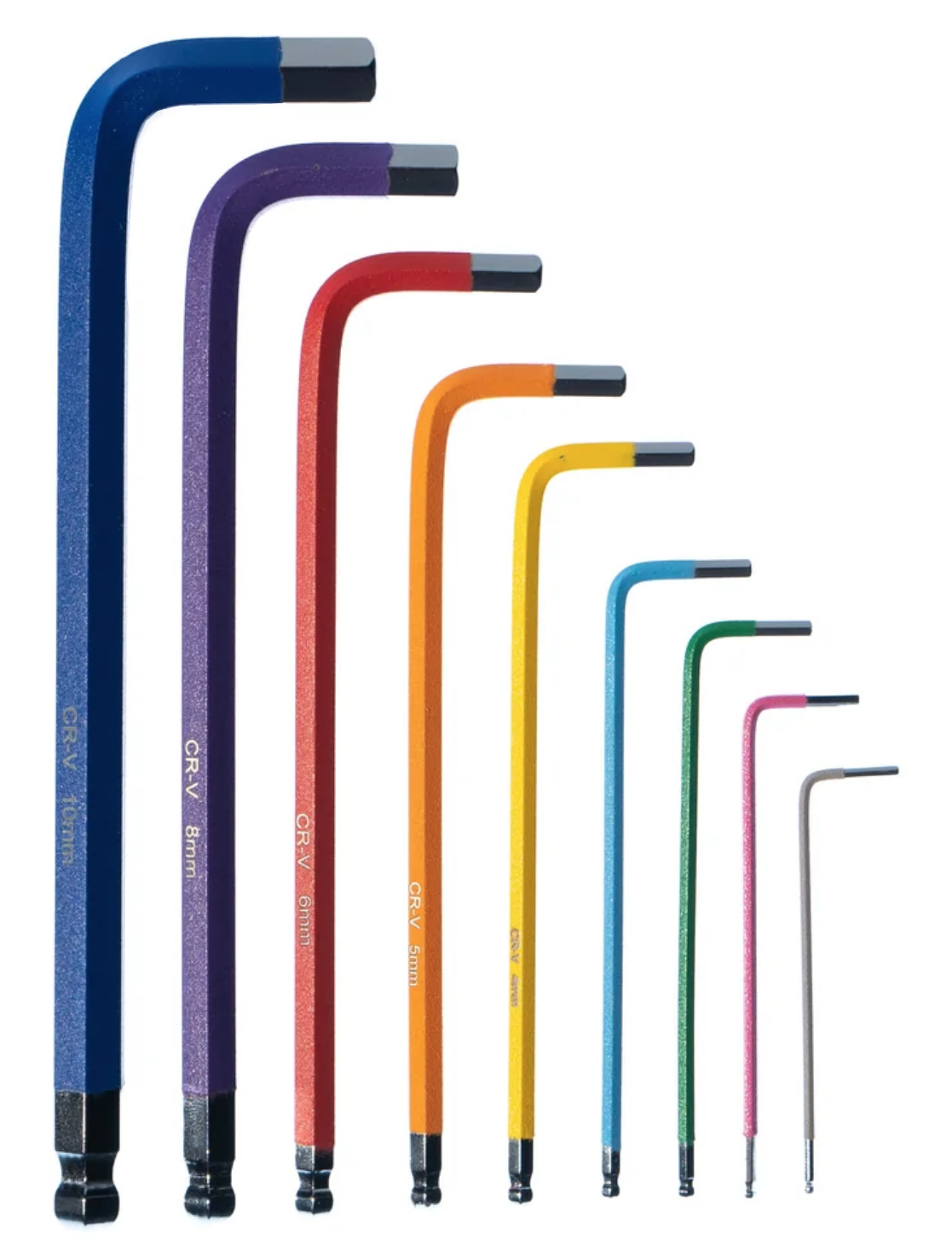 Juego de 9 llaves métricas de tamaños: 1,5mm, 2,0mm, 2,5mm, 3,0mm, 4,0mm, 5,0mm, 6,0mm, 8,0mm y 10mm.