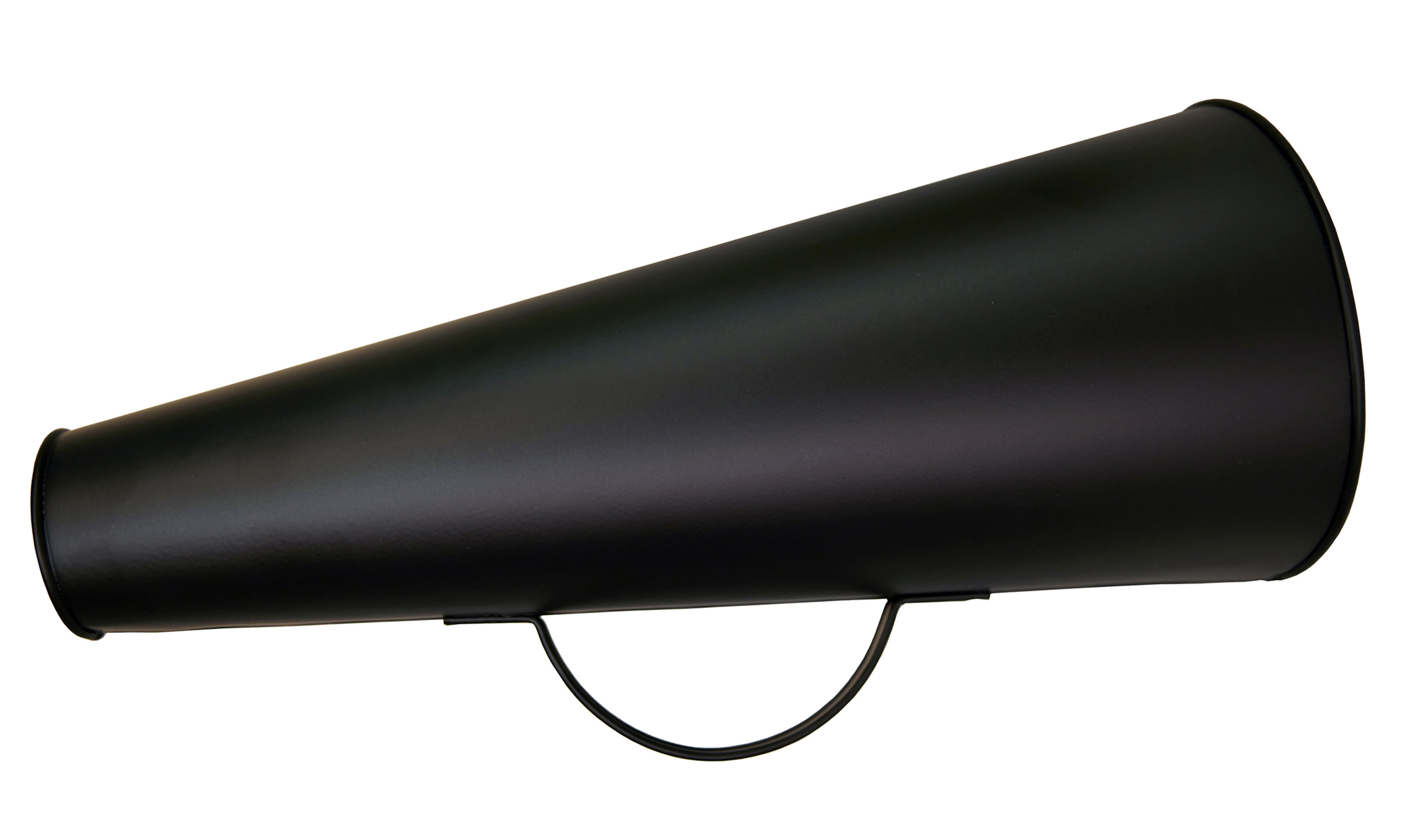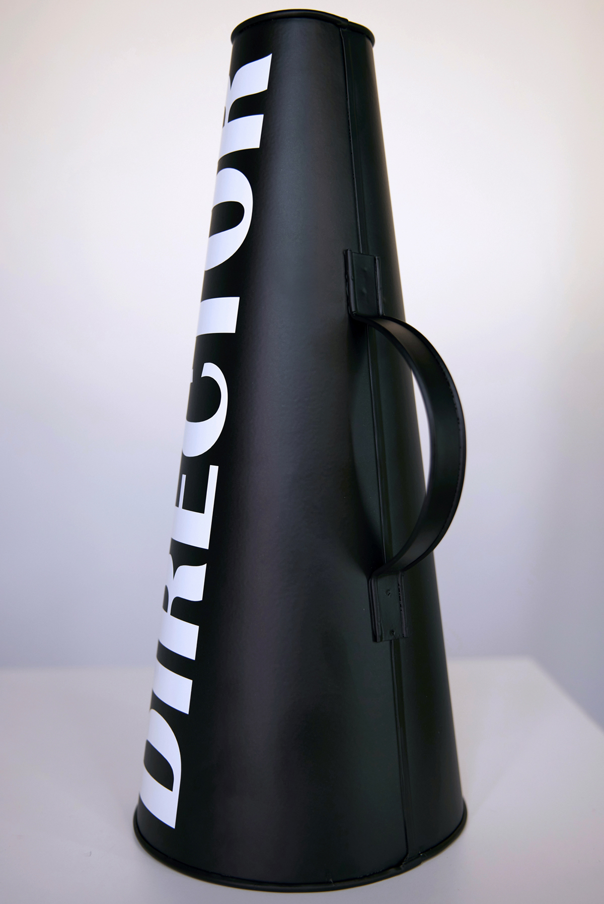 Esta bocina de director de cine, o megáfono clásico, es un producto exclusivo. Fabricada en metal resistente y acabada en color negro mate con detalles en blanco, reproduce con fidelidad el estilo retro de las bocinas utilizadas en los rodajes de cine clásico.