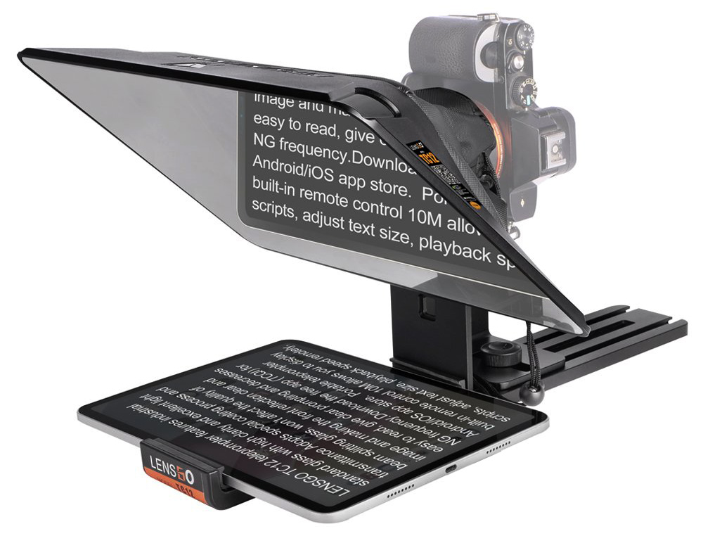 El teleprompter TC12 de la marca LensGo TC12 está diseñado para integrarse con cámaras DSLR, o mirrorless, y tablets de hasta 12,9″. Es perfecto para rodajes, entrevistas, streaming y producciones audiovisuales. Su diseño modular y fácil montaje lo hacen muy versátil para distintos setups.
